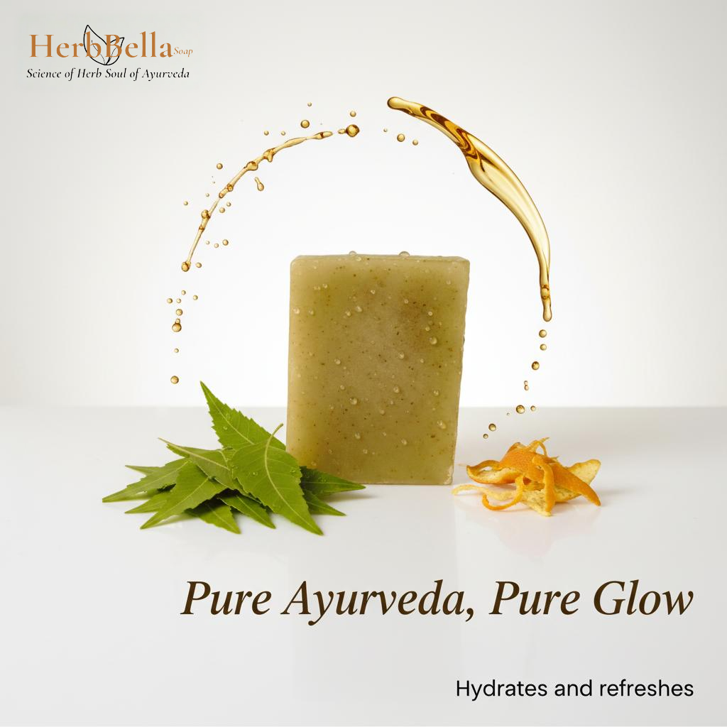 Experience the power of nature with HerbBella Neem Leaf & Orange Peel Handmade Soap, a refreshing Ayurvedic blend that deeply cleanses, detoxifies, and rejuvenates your skin.
